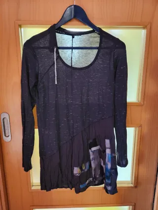 Vestido o túnica de manga larga con un diseño asimétrico y estampado abstracto en la parte inferior. - Tejido ligero con detalles plateados. - Panel inferior con estampado artístico. - Cierre de cordón decorativo en el cuello.
