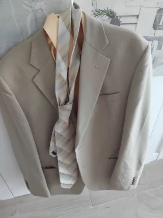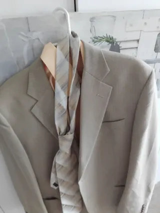Conjunto de traje de vestir con camisa y corbata. - Traje de vestir color beige. - Camisa color salmón. - Corbata a rayas en tonos beige y gris.