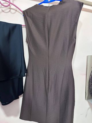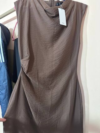 Vestido corto de Mango, sin estrenar. Su tejido tiene una textura arrugada y un acabado satinado que le da un toque elegante. - Diseño drapeado. - Cierre de cremallera. - Sin mangas.