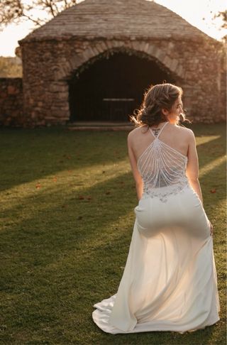 Elegante vestido de novia con corte sirena y detalles de pedrería en la espalda. - Corte sirena. - Espalda con pedrería. - Diseño halter.