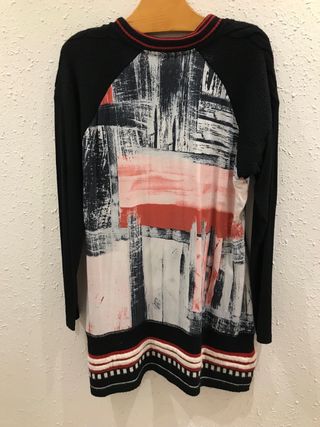 Vestido de punto con un diseño abstracto y moderno. - Mangas largas de punto negro. - Cuerpo estampado en blanco, negro, rojo y rosa. - Bajo con banda de punto a rayas rojas y blancas. mide: hombros 41, ancho 50, cintura 47, largo 77 consta talla 50 mirar medidas