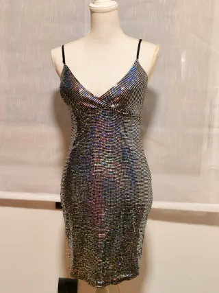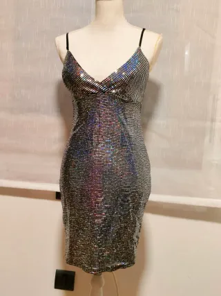 Vestido corto con un diseño llamativo y favorecedor. - Corte ajustado. - Escote en V pronunciado. - Tejido con acabado brillante y efecto multicolor. Se recoge en manresa o también hago envíos