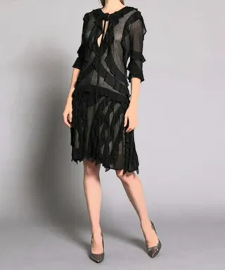 Elegante vestido de la marca Dsquared2, con etiqueta. - Diseño en color negro. - Tejido con volantes y transparencias. - Manga tres cuartos. - Escote con lazada. Marca talla XL pero sirve para S M L. Medidas: largo 99 sisa sisa 38 espalda 37 ( medidas aprox porque la ropa es muy elastica y el cuello en V cede, pero son tomadas con cinta cuello anudado )