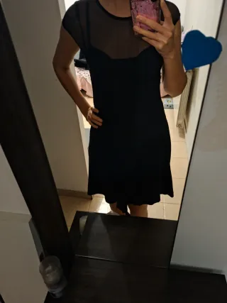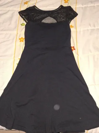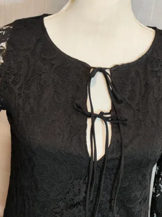 Vestido negro con detalles de encaje en la parte superior y mangas cortas. - Diseño con escote redondo. - Abertura en forma de corazón en el pecho. - Falda con vuelo.