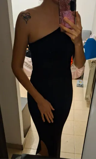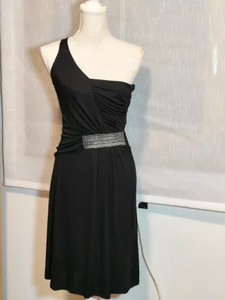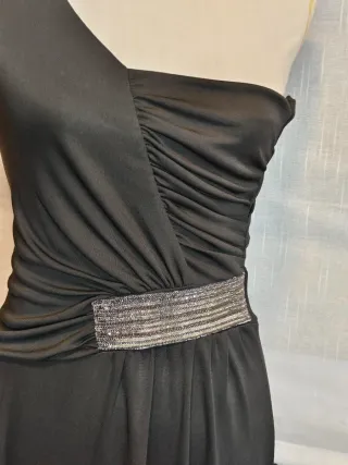 Elegante vestido negro con un diseño asimétrico que resulta muy favorecedor. La cintura está realzada con un detalle brillante. - Corte asimétrico. - Detalle de pedrería en la cintura. - Diseño drapeado en el torso.
