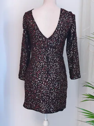Vestido corto con lentejuelas y forro interior. Diseño ceñido y manga larga. - Lentejuelas brillantes. - Corte ajustado. - Manga larga.
