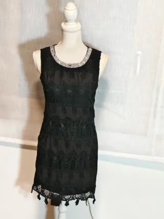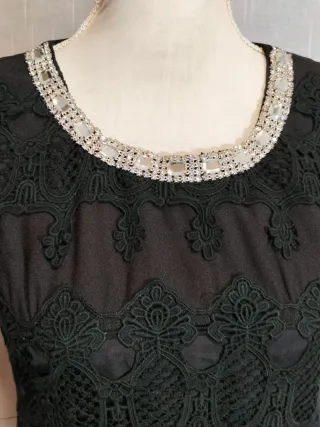 Elegante vestido negro con detalles de encaje y cuello adornado con pedrería plateada. - Diseño sin mangas. - Encaje intrincado a lo largo de la prenda. - Adorno de pedrería en el escote. Color negro