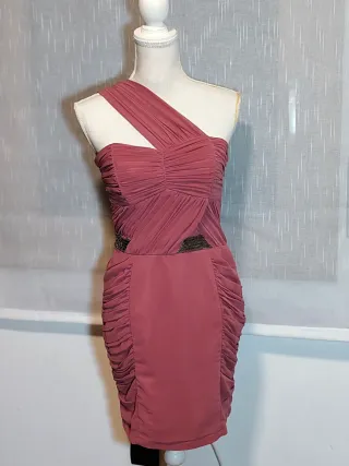 Vestido corto con un diseño muy lindo. - Corte ceñido al cuerpo. - Detalle de pedrería en la cintura. - Diseño de un solo hombro. - Fruncido en la parte superior y falda.