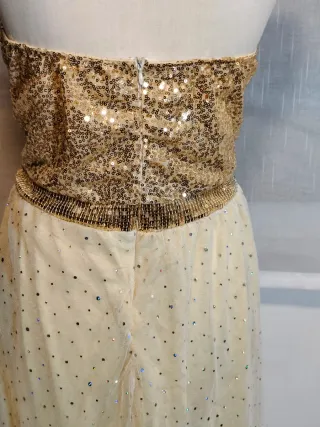Elegante vestido largo sin tirantes, perfecto para eventos especiales. Combina un corpiño brillante con una falda vaporosa. - Corpiño adornado con lentejuelas doradas. - Falda de gasa con pequeños detalles brillantes. - Diseño sin tirantes.