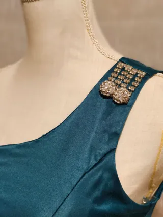 Elegante vestido de fiesta para señora, con un diseño sofisticado. - Detalle de pedrería y plisados. - Mangas cortas abullonadas. - Cierre con botones en el hombro.