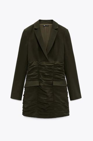 Vestido tipo blazer de Zara, de estilo entallado con fruncido central que realza la silueta. Nuevo con etiqueta, sin estrenar. Color verde caqui oscuro. Cuello con solapa y manga larga. Ideal para eventos, cenas o para un look arreglado con botas o tacones. ▪️ Talla: XS ▪️ Marca: Zara Escríbeme ante cualquier duda.