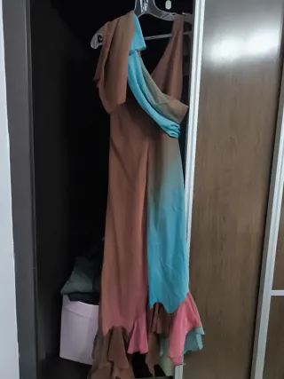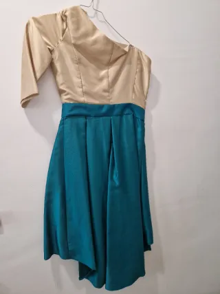 Elegante vestido de fiesta, ideal para bodas o eventos especiales. Su diseño asimétrico y drapeado le da un toque sofisticado. Solo m lo he puesto una vez - Diseño de un solo hombro. - Adorno de pedrería en el hombro. - Falda con varias capas de tela.