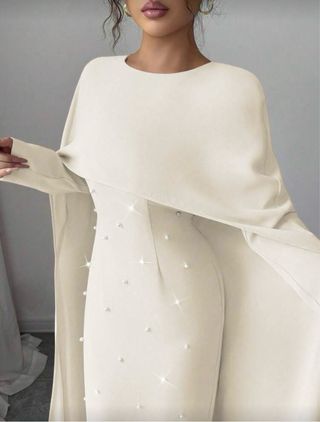 Vestido largo de corte recto con un diseño sofisticado y detalles de perlas. - Mangas largas. - Capa incorporada. - Adornado con perlas. - Escote barco.