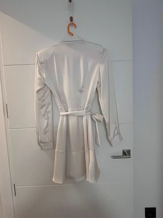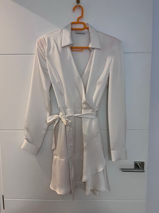 Elegante vestido cruzado de tejido satinado en color blanco crudo. Presenta un diseño con cuello camisero y cinturón para anudar a la cintura. - Manga larga. - Falda con volantes. - Cierre cruzado.