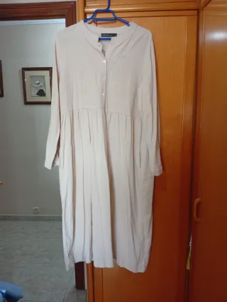 Vestido largo de manga larga con un diseño elegante y cómodo. - Cuello redondo con detalle bordado. - Cierre de botones en la parte delantera. - Cintura fruncida para un ajuste favorecedor. - Bolsillos laterales. - Tejido ligero y transpirable.