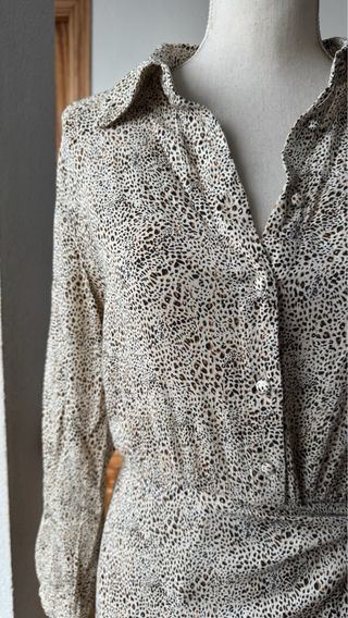 Vestido con estampado animal print de manchas en tonos beige y marrón. Tiene cuello de camisa y cierre de botones. - Manga larga. - Cinturón anudado a la cintura. - Diseño cruzado en la falda.