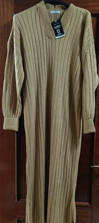 Vestido largo de punto con un diseño acanalado que le da textura. Es una prenda versátil y cómoda. - Diseño acanalado vertical. - Cuello en V. - Mangas largas abullonadas. - Largo hasta los tobillos. - Abertura lateral.