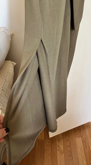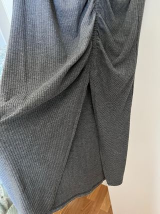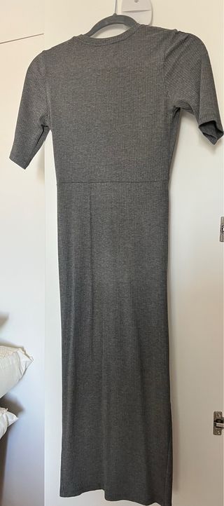 Vestido midi de canalé en color gris. Un básico versátil para tu armario. - Tejido elástico y cómodo. - Largo midi. - Manga corta. - con abertura lateral