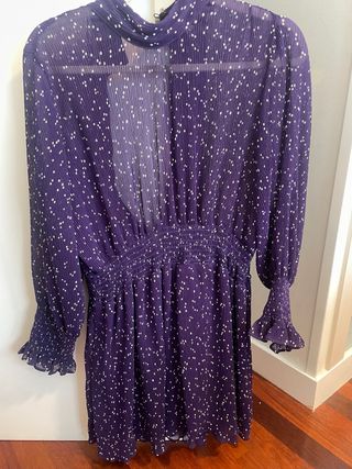 Vestido morado con estampado de lunares blancos. Presenta un diseño plisado y detalles elásticos en la cintura y puños. - Manga larga abullonada. - Cuello alto. - Estampado de puntos.