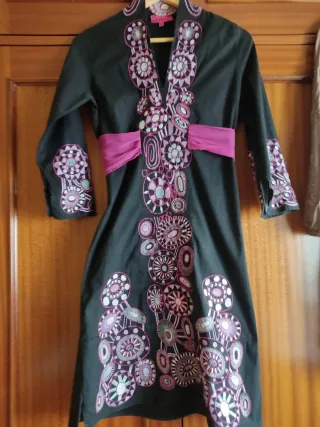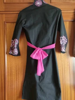 Vestido negro con detalles bordados y cinturón rosa. - Tejido de algodón elástico. - Mangas con bordados. - Cuello con bordados. - Cinturón de tela rosa.