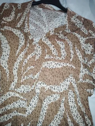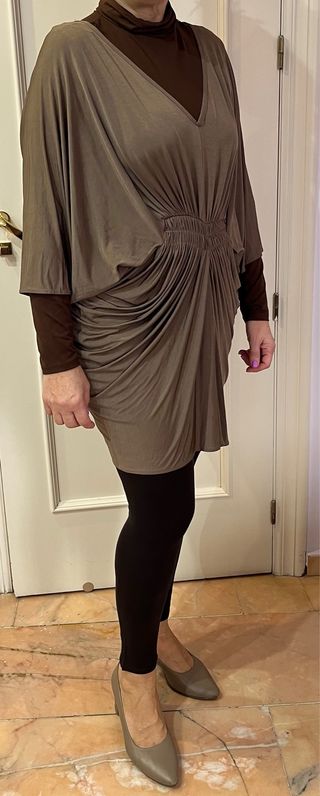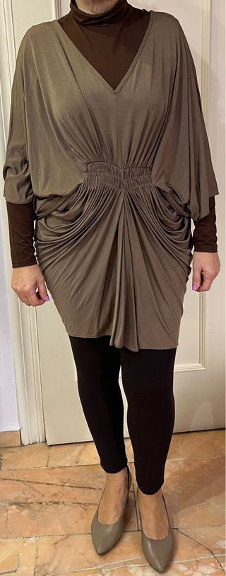 Blusón o vestido, es de Zara aunque tiene quitada la etiqueta porque me molestaba en el cuello, da talla hasta L sin problema, tela con mucha caída, escote en pico con frunce en cintura (disimula barriguita ) color marrón. - Tejido suave y fluido. - Cintura elástica fruncida. - Mangas murciélago