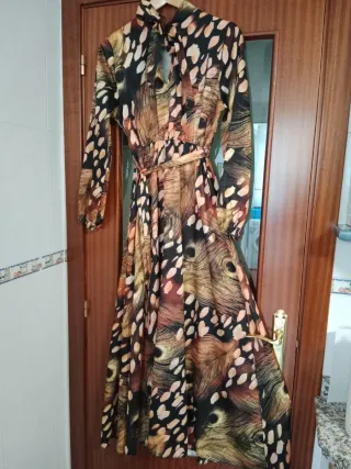 Vestido largo con un bonito estampado. Talla única - Diseño con cuello alto y lazada. - Cintura elástica. Cinturón del mismo estampado. - Mangas largas abullonadas con elástico en puños. Nuevo sin etiqueta.
