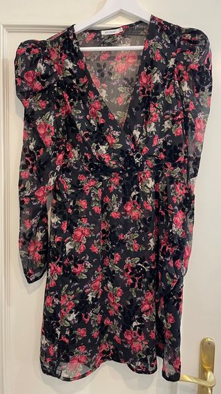 Vestido de manga larga con escote de pico y detalles de volantes con estampado floral . - Diseño con estampado de flores rosas y negras. - Mangas largas abullonadas. - Escote cruzado en pico Talla S/M. Ancho de hombros 33 cm y largo 82. - Detalle de volantes.
