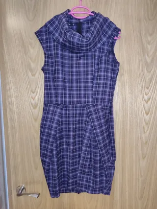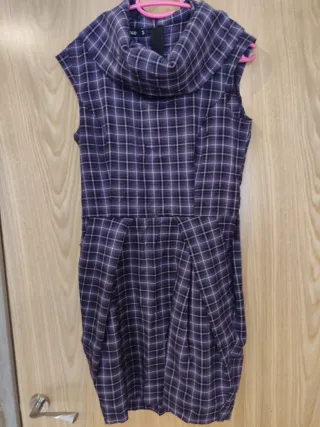 Vestido corto con estampado de cuadros en tonos morados y negro. Tiene un diseño elegante con cuello tipo cascada, ideal para las cenas y comidas de estas fechas.