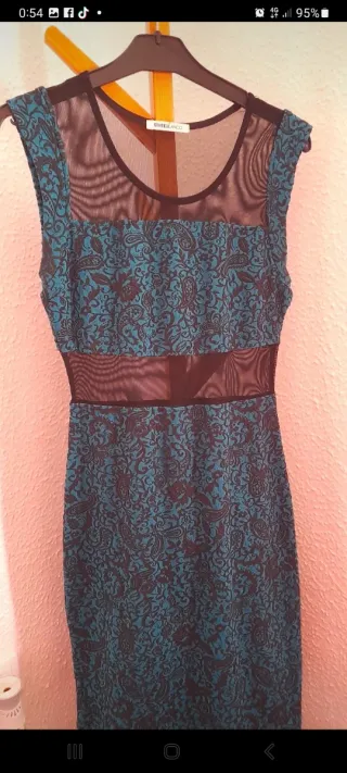 Vestido de Sfera con un diseño llamativo. Ideal para estas navidades - Tejido con estampado floral en verde y negro. - Detalle de transparencias en la zona del escote, cintura y espalda - Corte ajustado.