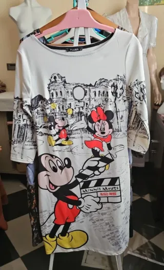 Vestido blanco con estampado de Mickey y Minnie Mouse. Nuevo sin etiquwea - Diseño con personajes de Disney. - Manga larga. - Estampado de ciudad y claqueta de cine.