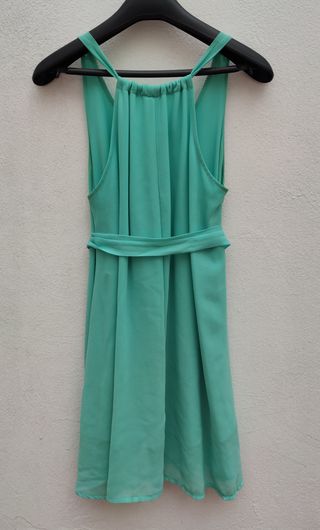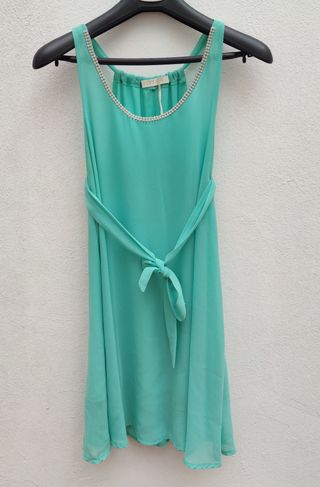 Vestido de la marca COCO en un bonito color verde esmeralda. Ideal para cualquier ocasión. Se puede poner con cinturon o sin el. - Diseño sin mangas. - Detalle de pedrería en el cuello. - Cinturón anudado a la cintura. - Tejido ligero y vaporoso (poliéter). - Talla: 42 / XL. - Medidas: 80 cm. de largo y 43 cm. de pecho. - Estado: muy bueno, se ha usado una sola vez.