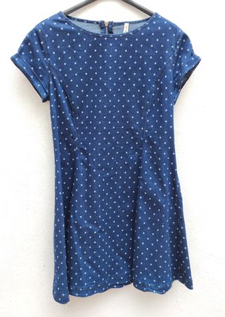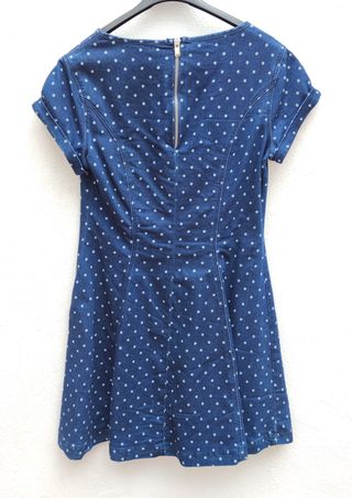 Vestido vaquero de Stradivarius con estampado de topos. Es ajustado arriba y la falda tipo skater. - Diseño de manga corta. - Cremallera trasera. - Corte acampanado. - Talla: 40 / L. - Medidas: 82 cm. de largo y 40 cm. de pecho. - Estado: muy bueno, en prefecto estado. Usado 2-3 veces.