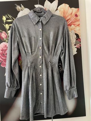 Vestido de fiesta con un diseño brillante y elegante. - Tejido con acabado metalizado. - Cuello camisero. - Cierre de botones. - Mangas largas abullonadas.