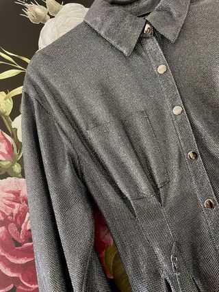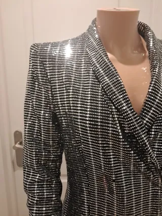 Vestido tipo chaqueta con lentejuelas plateadas y negras. Un diseño muy llamativo y elegante. - Corte blazer. - Manga larga. - Escote pico