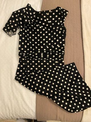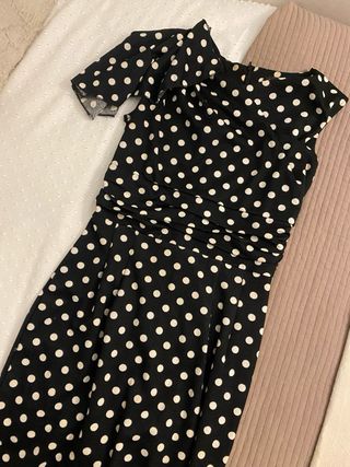 Vestido elegante con estampado de lunares. Talla S Se ajusta a la cintura. Volante en un hombro.