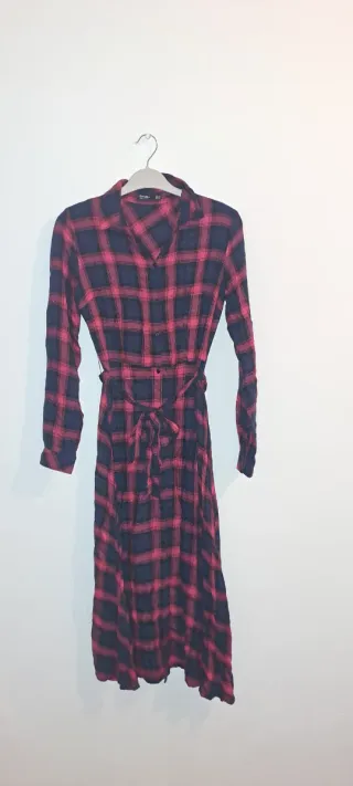 Vestido largo de Bershka con estampado de cuadros. - Diseño camisero. - Cinturón a juego. - Manga larga.