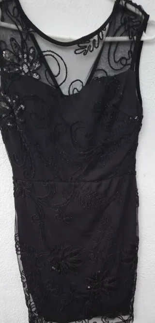 Elegante vestido negro, ideal para eventos y fiestas. Su diseño con detalles de lentejuelas y bordados le da un toque sofisticado. Cierra con cremallera dorada. (espalda) Espalda 40, largo 89. Busto 86 (tiene copas) cintura 70 cms. - Escote ilusión con bordados. - Cuerpo con lentejuelas. - Falda recta. - Cierre de cremallera oculta.