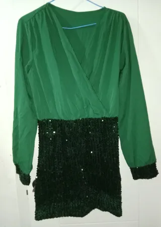 Vestido de fiesta con un diseño brillante y escote en V. La parte superior es de manga larga y la falda está adornada con lentejuelas. - Manga larga. - Falda con lentejuelas.
