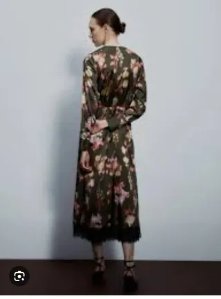 Vestido largo de Sfera con un estampado floral vibrante sobre fondo verde. Presenta un diseño cruzado en la parte delantera con un nudo y detalle de encaje negro en el bajo. - Manga larga. - Tejido satinado. - Estampado floral multicolor.