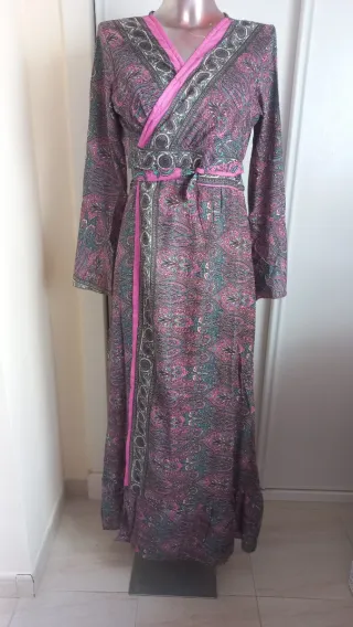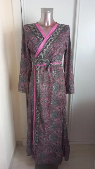 Elegante vestido cruzado de seda con un estampado vibrante en tonos rosas y grises. Su diseño fluido lo hace ideal para diversas ocasiones. - Manga larga. - Cinturón a juego para ajustar la silueta. - Escote en V pronunciado.