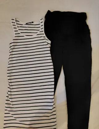 Conjunto de vestido y pantalones para premamá. El vestido es de rayas y los pantalones son negros. - Vestido sin mangas. - Pantalones con cinturilla alta. T36 pero vale para T38 también.