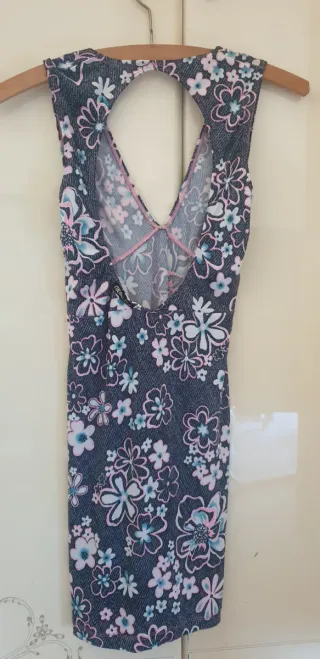 Vestido corto con estampado floral y escote en la espalda. - Diseño ajustado. - Estampado de flores en tonos rosas y azules. - Abertura en la espalda.