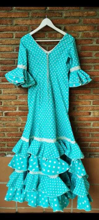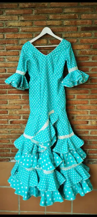 Vestido de flamenca con un alegre estampado de lunares blancos sobre fondo turquesa. Talla 14 o S Diseñado con volantes y detalles de encaje. - Mangas con volantes. - Múltiples volantes en la falda. - Adornos de encaje blanco. Tiene para sacarle y arreglarlo.