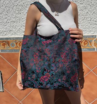 Conjunto de diez bolsos tipo tote bag, confeccionados en tela con un diseño inspirado en el vestido de fallera. - Estampado floral multicolor. - Asas cómodas para llevar al hombro.