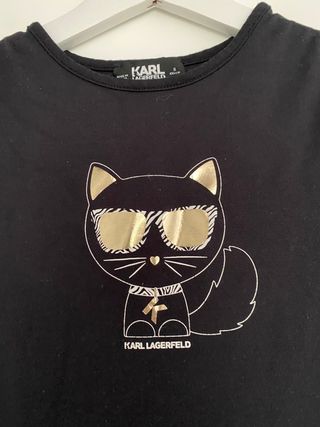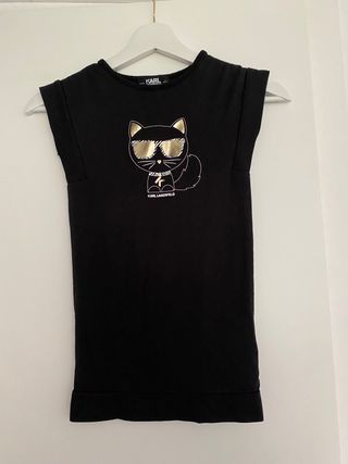 Vestido negro para niña de Karl Lagerfeld con un divertido estampado de gato con gafas doradas. Talla 5, 106 cm - Diseño sin mangas. - Detalle de logo en la parte inferior. - Acabado metálico en el estampado.