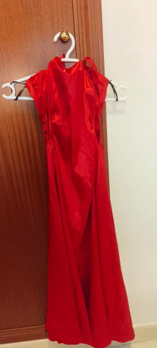 Vestido largo de color rojo, con un diseño sofisticado y moderno. Ideal para eventos especiales. - Tejido satinado brillante. - Escote alto. - Abertura lateral.