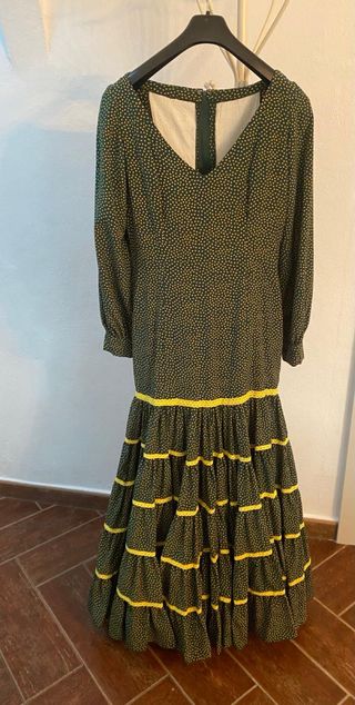 El vestido que se muestra en la imagen es un traje de flamenca (también conocido como traje de gitana o sevillana), caracterizado por su color verde manzana con pequeños lunares blancos y detalles de volantes en color azul marino con lunares. Este tipo de vestimenta es tradicional en las ferias y romerías de Andalucía, como la Feria de Abril. Puedes encontrar diseños similares tanto nuevos como de segunda mano en diversas tiendas especializadas: Opciones de Compra y Estilos Similares Segunda Mano: En plataformas como Wallapop o Vinted, es común encontrar trajes de flamenca para niñas y adultos en excelentes condiciones. Se han