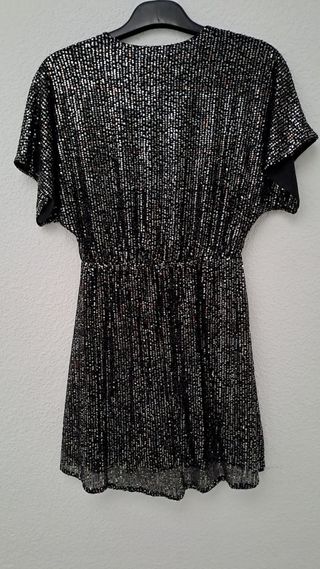 Vestido uso real 1 sola vez para Año Nuevo y nunca más, esta prácticamente nuevo. Es de KIABI y lo pagué 20 euros Vestido corto con un diseño brillante y elegante. Es un poco transparente, apenas - Manga corta. - Escote en V. - Cintura elástica. -Tiene forro por debajo