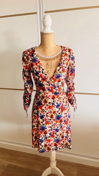Vestido de Naf Naf con un estampado floral vibrante. Presenta un diseño cruzado y mangas largas con detalle de lazada. - Estampado floral multicolor. - Diseño cruzado. - Mangas largas con lazada. - Corte favorecedor. Es de viscosa 100% y te lo puedes poner con una camiseta blanca de tirantes debajo o de otro color Usado solo un dia Oportunidad!! Me mudo vendo todo mira mi perfil y llevate mas cosas por un modico precio gracias