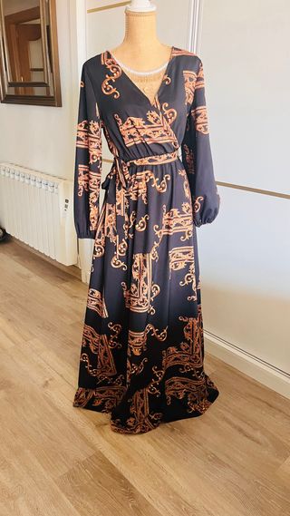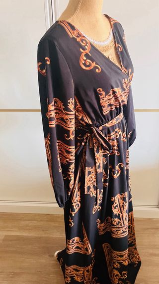 Elegante vestido largo con un llamativo estampado. - Diseño con estampado barroco en tonos dorados. - Cinturón a juego para ceñir la cintura. - Mangas largas abullonadas. Oportunidad!! Me mudo vendo todo mira mi perfil y llevate mas cosas por un modico precio gracias